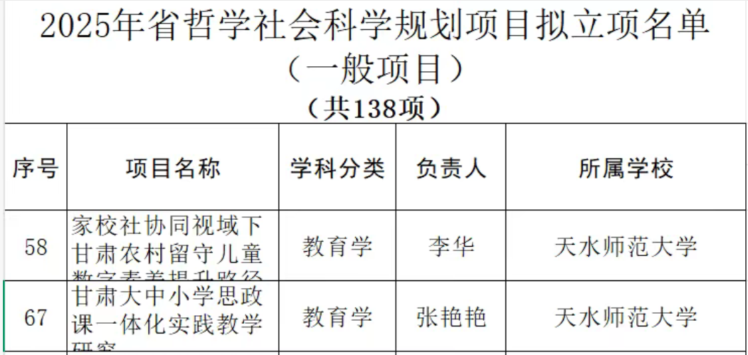 近日,甘肃省哲学社会科学规划办公室公布2025年度省社科规划项目拟立项名单。公司李华博士申报的“家—家—校—社协同视域下甘肃农村留守儿童数字素养提升路径研究”和张艳艳博士申报的“甘肃大中小学思政课一体化实践教学研究”双双入选,标志着公司更名为大学以来在省级项目建设上取得又一新突破。